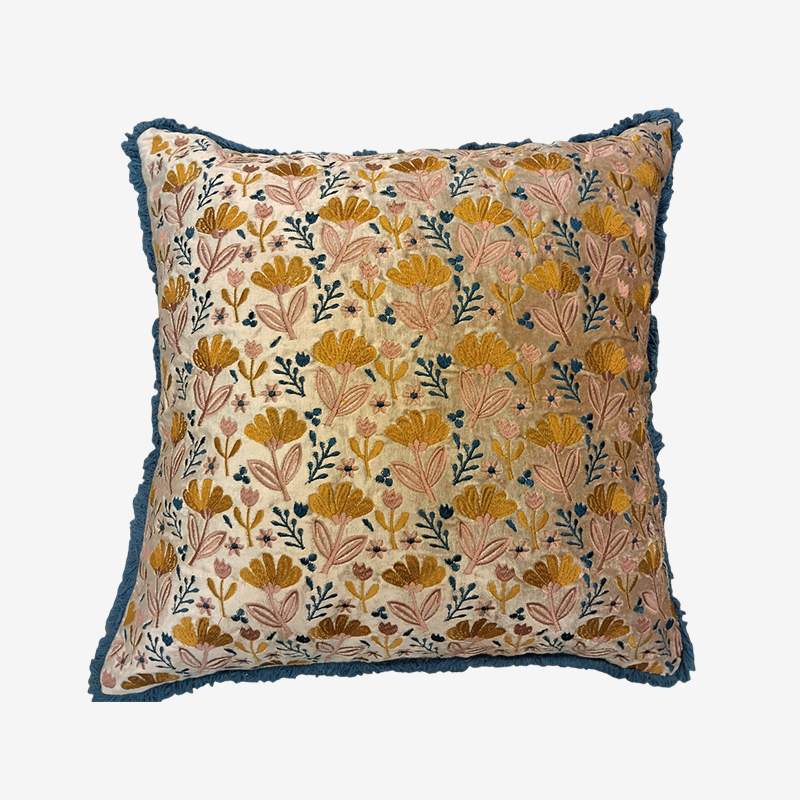 CUSHION COVER ONLY. FRONT BACK VISCOSE VELVET WITH TEXTURA FRINGE, SATIN STITCH EMBROIDERY. FRONT NATURAL AND BACK OCHRE
