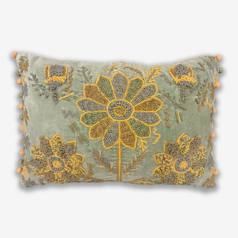 FRONT & BACK 100% COTTON VELVET, FRONT LINED, HAND THREAD EMBROIDERY, HAND MADE COTTON SHEETING POM POM ON TWO SHORTER SIDE