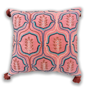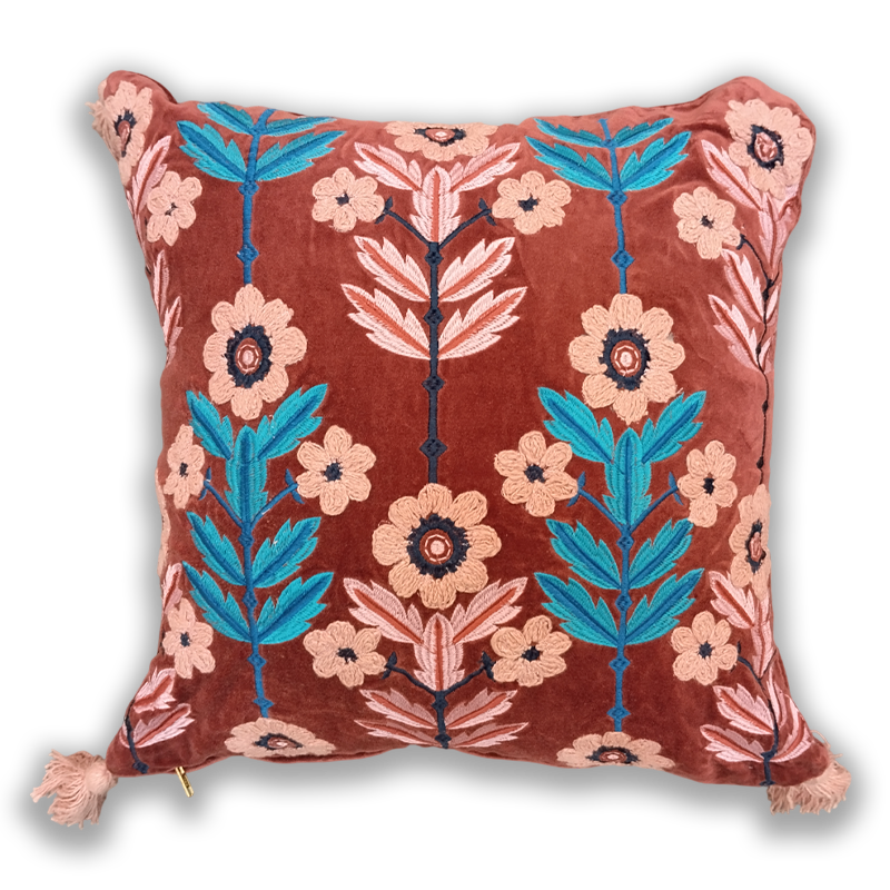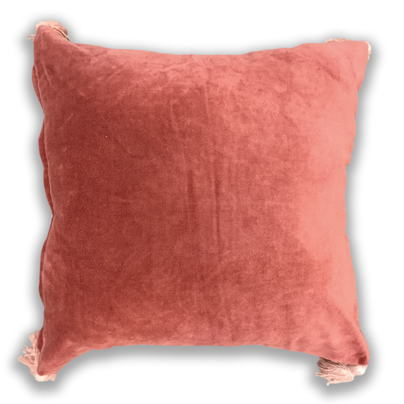 FRONT & BACK 100% COTTON VELVET , TNT THREAD & MACHINE SATIN STITCH EMBROIDERY , 01 TNT TASSEL ON EACH CORNER , TOTAL 04 TASSEL, WITH METAL ZIPPER YKK