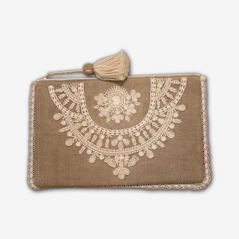 Size : 20X30 CM POUCH ON COTTON COCO, WITH COTTON SHEETING LINING, RUBBER STIFFNER , HAND THREAD EMBROIDERY, WITH FANCY TASSEL ON ZIPPER