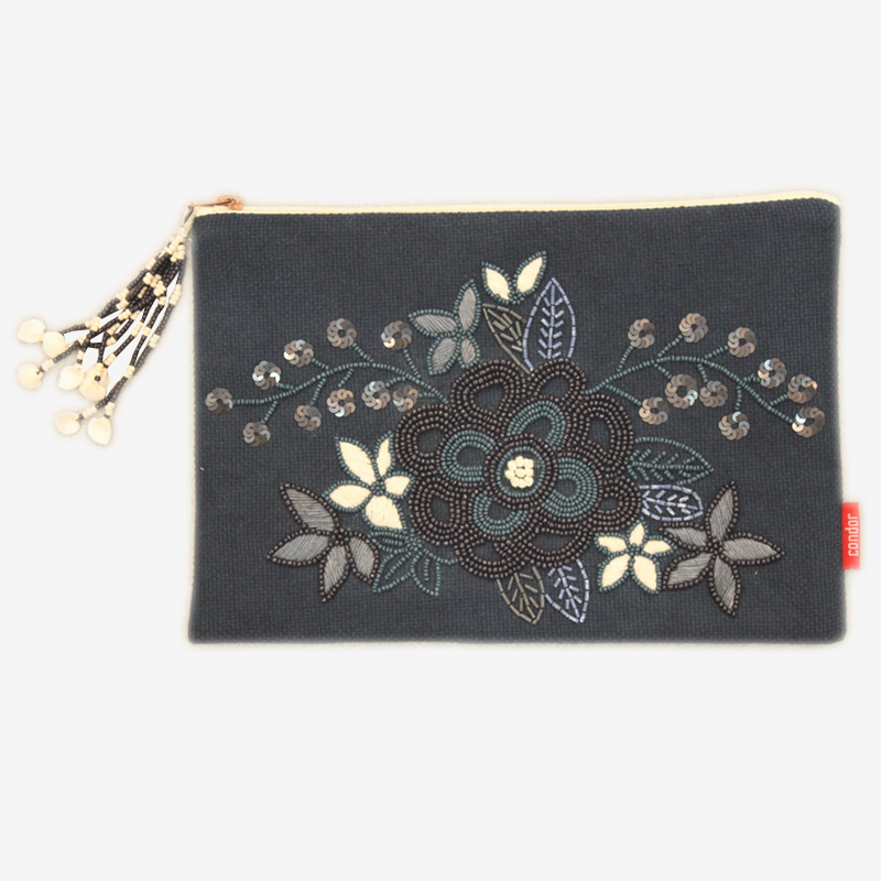 Size : 20X30 CM POUCH ON COTTON COCO, WITH COTTON SHEETING LINING, RUBBER STIFFNER , HAND THREAD EMBROIDERY, WITH FANCY TASSEL ON ZIPPER