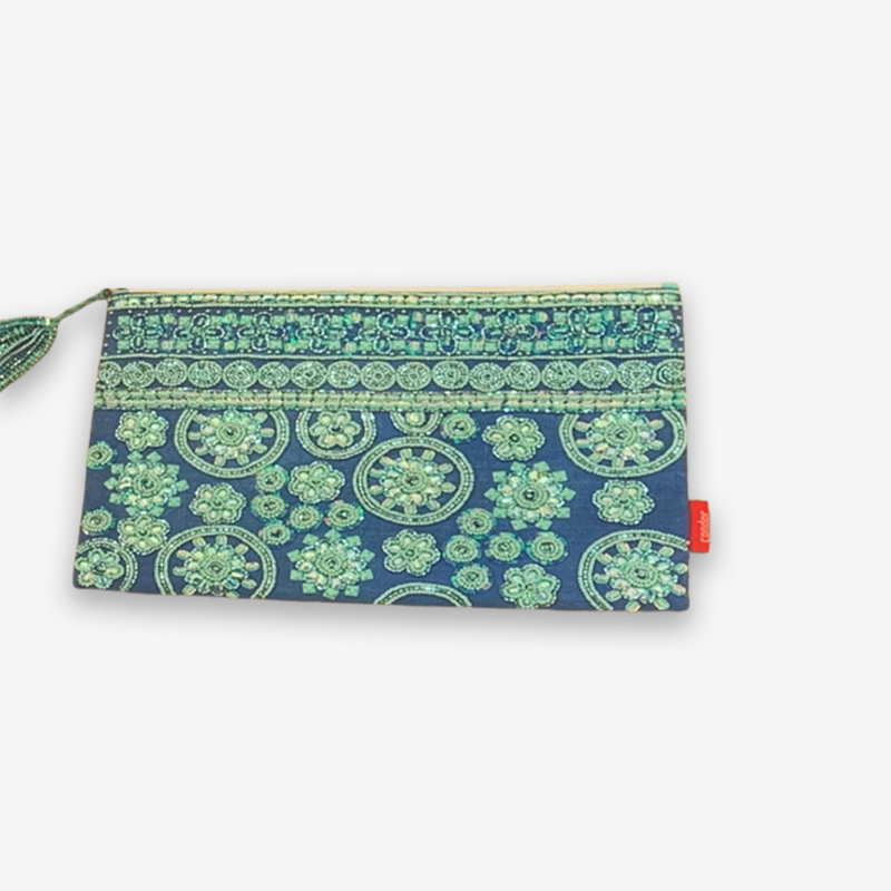 Size : 20X30 CM POUCH ON COTTON COCO, WITH COTTON SHEETING LINING, RUBBER STIFFNER , HAND THREAD EMBROIDERY, WITH FANCY TASSEL ON ZIPPER